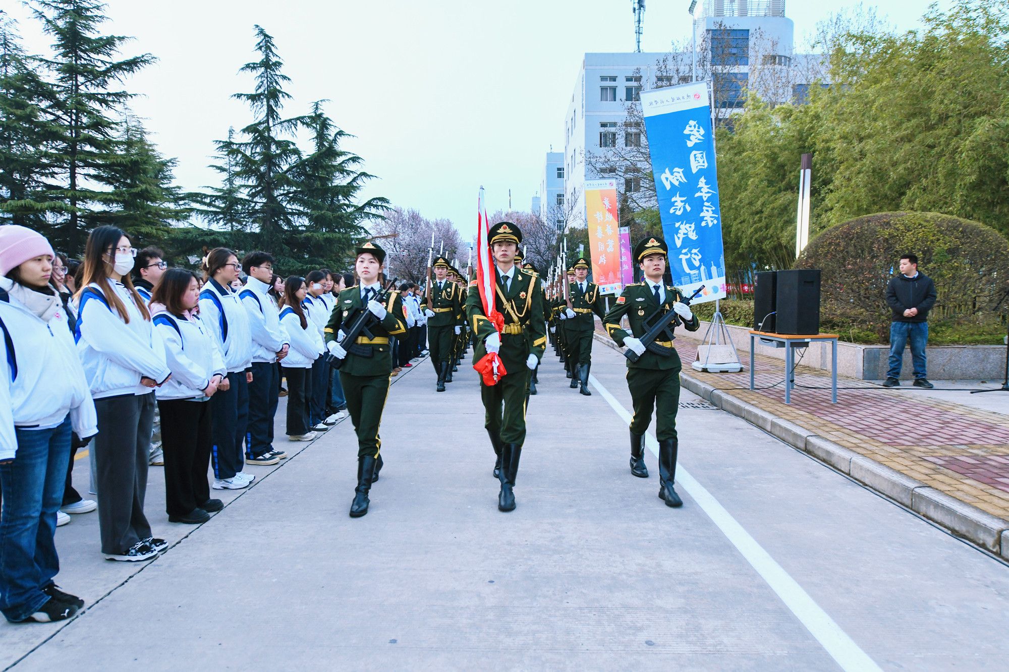 应用技术学院学生张梓萌同学作了国旗下的演讲,呼吁全体师生收心归位,迅速切换至学习模式,以雷锋精神砥砺前行,爱校荣校,以主人翁姿态讲好校园故事,万人同心同德,共同擦亮学校品牌,开启高质量发展新征程。应用技术学院学生的集体诗歌朗诵《青春向国旗,奋楫新征程》,以青春之声展现了广大学子众志成城、奋楫争先的坚定信念。